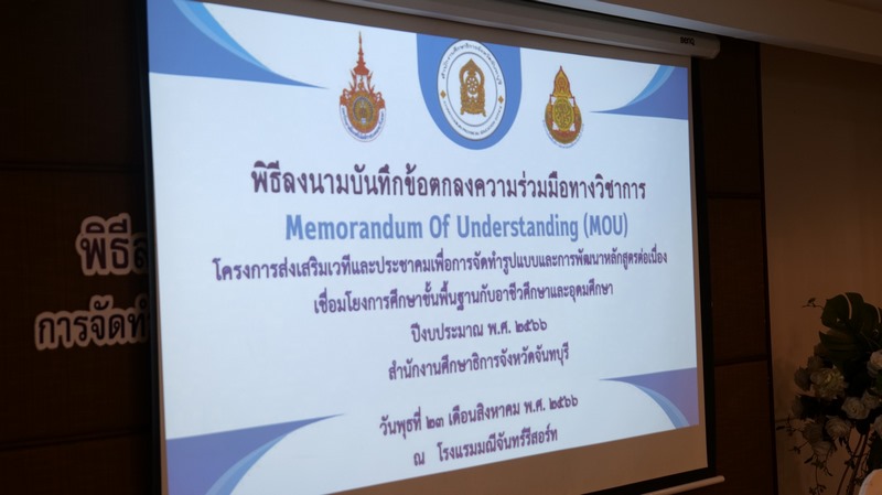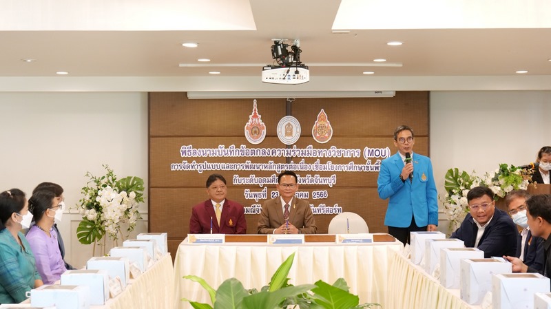 ผศ.ดร.คณาธิป จิระสัญญาณสกุล รองอธิการบดี มทร.ตะวันออก พร้อมด้วย ผศ.ดร.เทอดศักดิ์ ปุระมงคล คณบดีคณะเทคโนโลยีอุตสาหกรรมการเกษตร ผศ.กาญจนา ผลาผล คณบดีคณะเทคโนโลยีสังคม ผศ.ดร.ประหยัด กองสุข ผอ. โครงการจัดตั้งคณะวิศวกรรมศาสตร์ฯ ผศ.ดร.บุณฑริกา สุมะนา ผู้ช่วยอธิการบดี และคณะผู้บริหาร มทร.ตะวันออก วิทยาเขตจันทบุรี เข้าร่วมพิธีลงนามบันทึกข้อตกลงความมือทางวิชาการ (MOU) การจัดทำรูปแบบและการพัฒนาหลักสูตรต่อเนื่องเชื่อมโยงการศึกษาขั้นพื้นฐานกับระดับอุดมศึกษา จังหวัดจันทบุรี กับสำนักงานศึกษาธิการจังหวัดจันทบุรี และสำนักงานเขตพื้นที่การศึกษามัธยมศึกษา จันทบุรี ตราด (สพม.) ภายใต้โครงการส่งเสริมเวทีและประชาคมเพื่อการจัดทำรูปแบบและการพัฒนาหลักสูตรต่อเนื่องเชื่อมโยงการศึกษาขั้นพื้นฐานกับอาชีวศึกษาและอุดมศึกษา ปีงบประมาณ พ.ศ. 2566 ณ โรงแรมมณีจันทร์รีสอร์ท